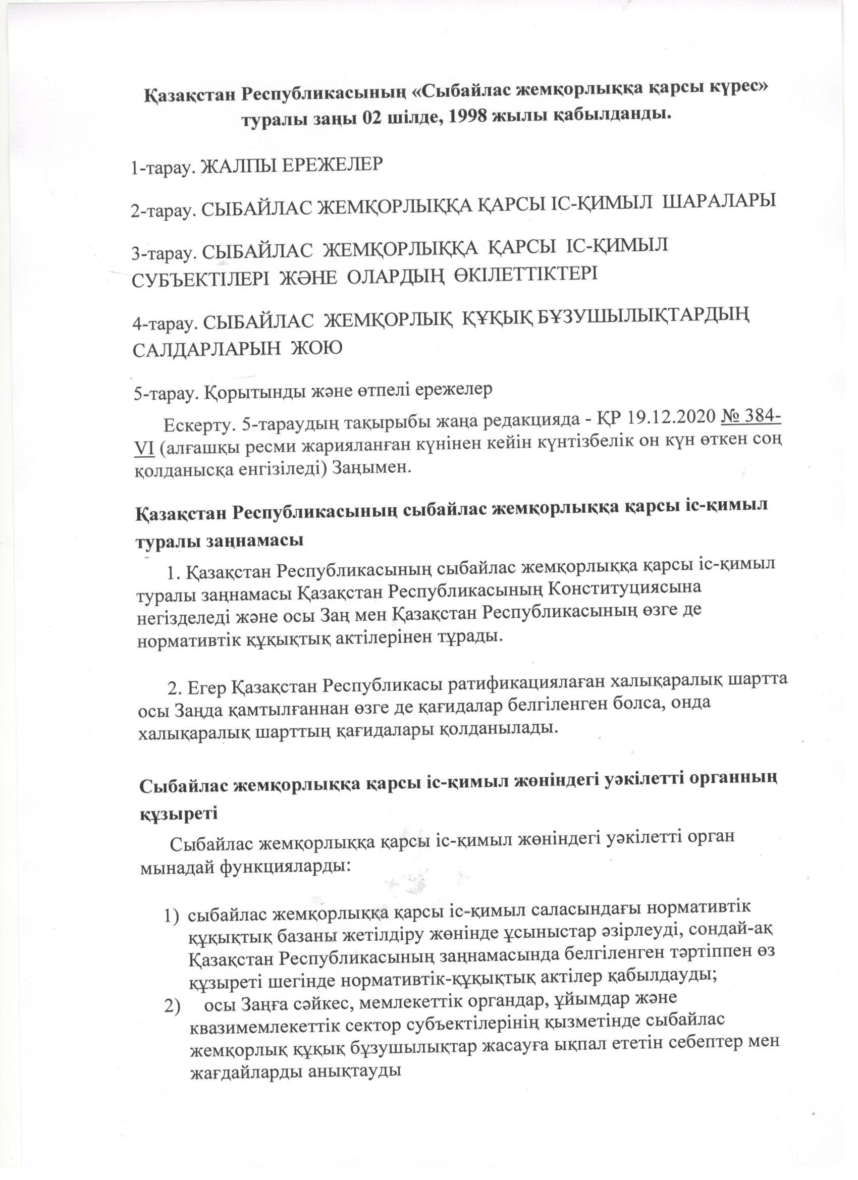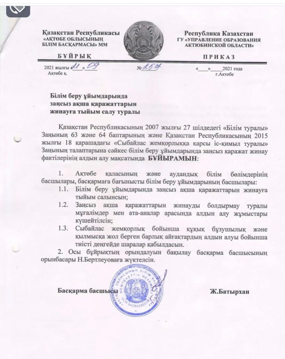 | 2 | Білім беру ұйымдарында қаражат жинауға тыйым салу, сыбайлас жемқорлықтың алдын алу туралы |